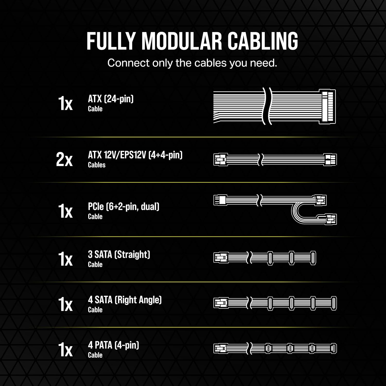 Modular i plotë – Furnizues energjie i besueshëm dhe efikas me zhurmë të ulët, me kabllot tërësisht modulare – lidh vetëm ato që i nevojiten sistemit tënd, për një ndërtim më të pastër dhe menaxhim më të mirë kabllosh.
