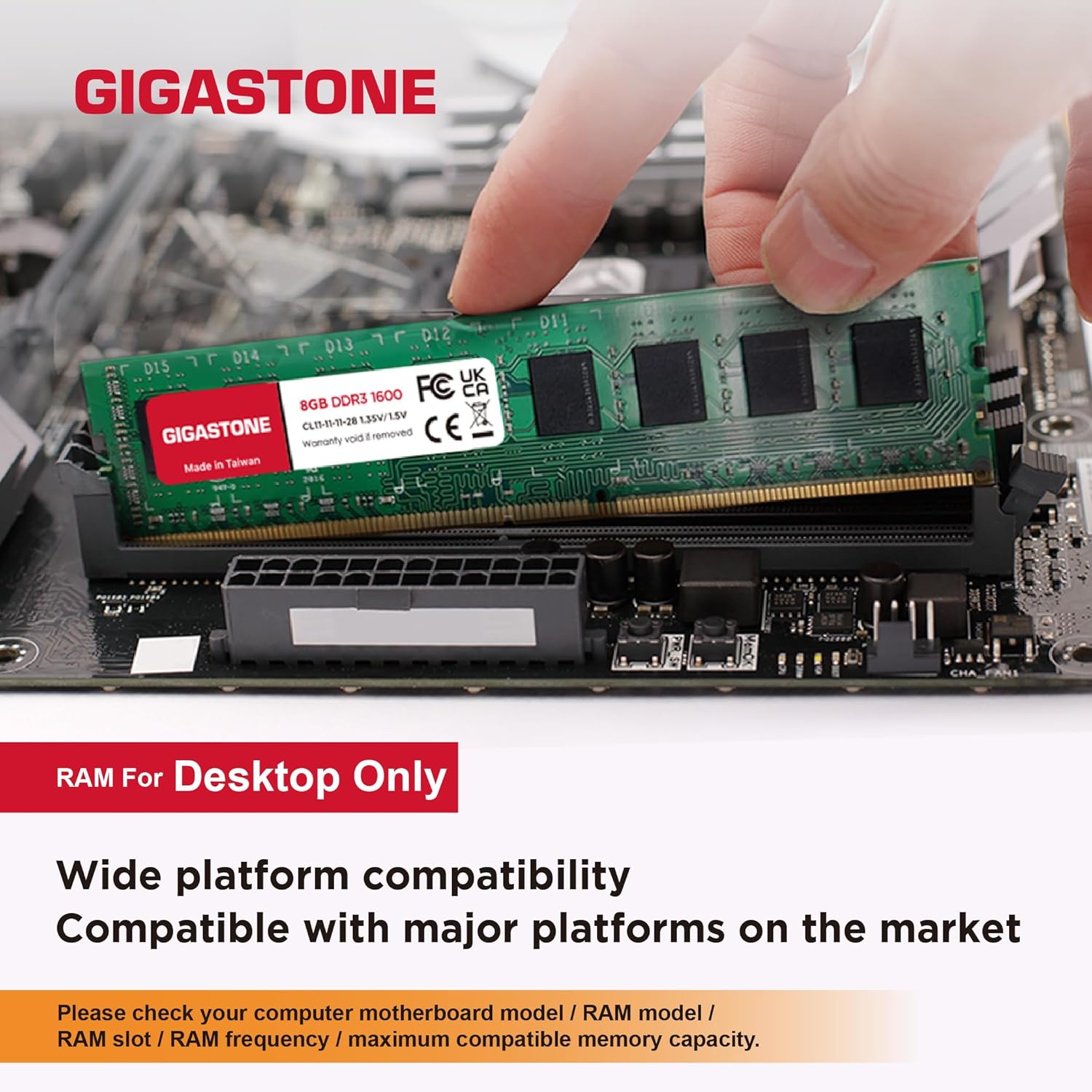【DDR3 RAM】 Gigastone RAM 8GB DDR3 1600MHz PC3-12800 CL11 1.5V UDIMM 240 pin Jo-ECC për kompjuterë desktop